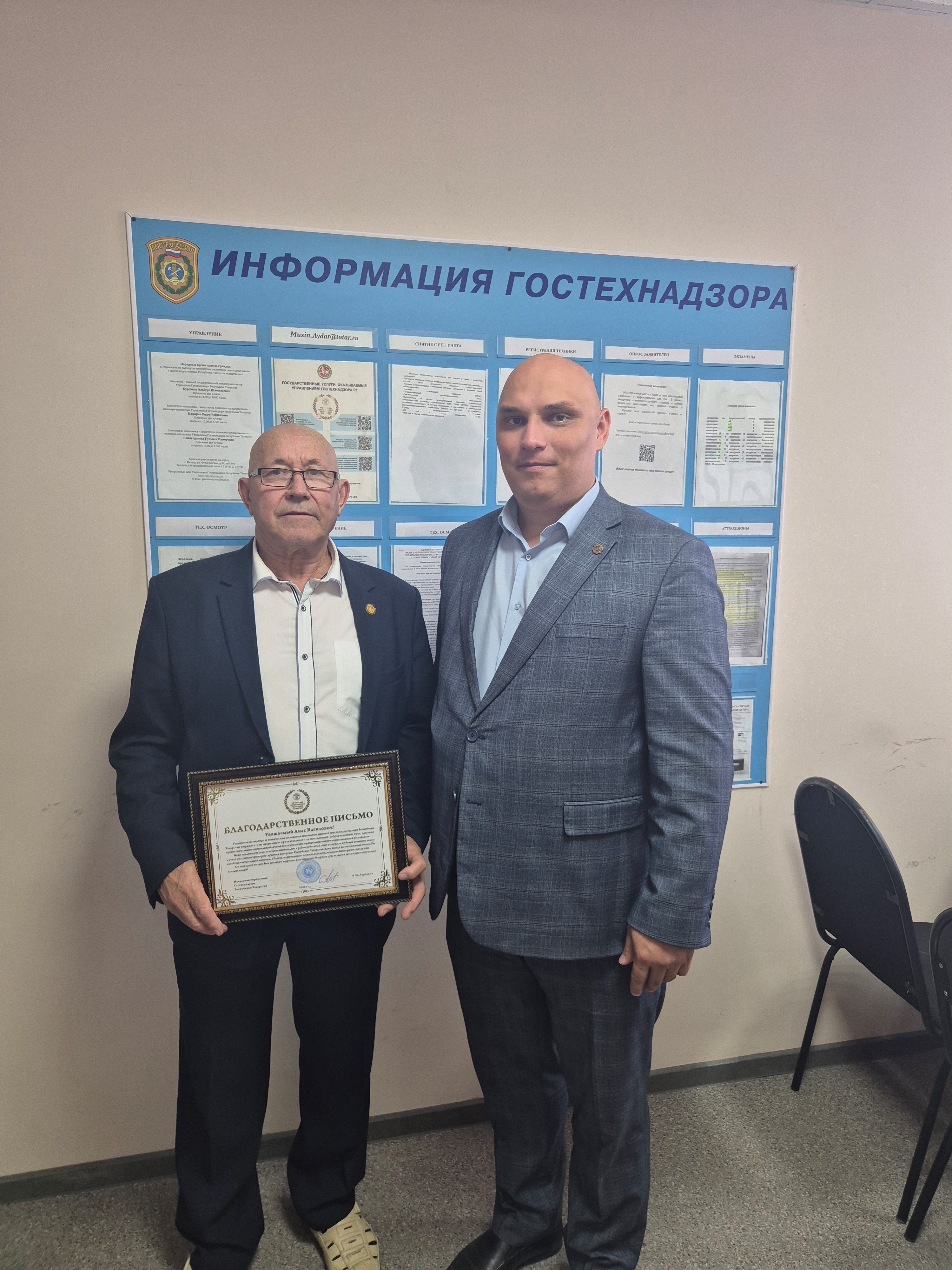 Далее состоялась встреча с ветераном службы Гостехнадзора Валеевым Анасом Вагизовичем, в ходе которой ему была вручена благодарность за многолетний труд и большой вклад в развитие службы Гостехнадзора по случаю юбилейного дня рождения.